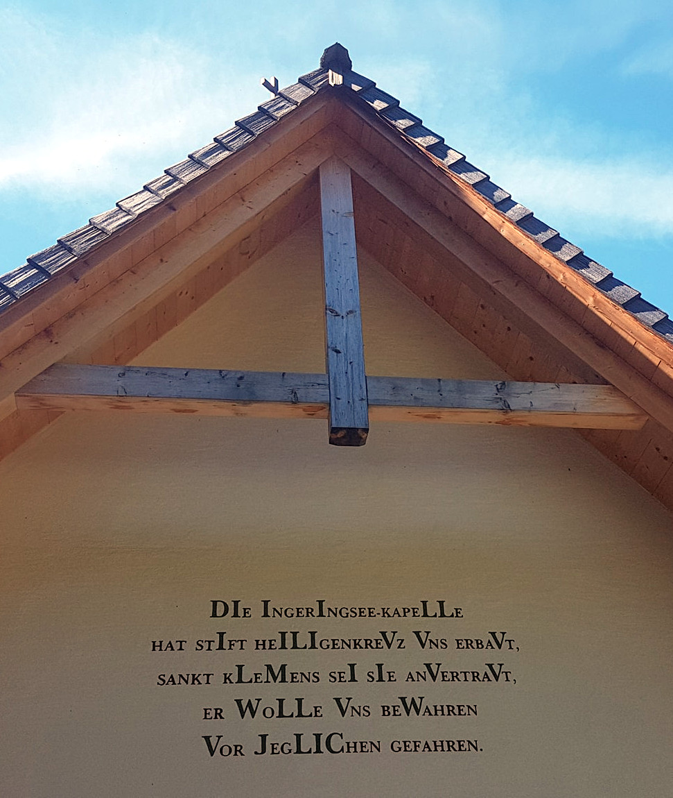 Bemerkenswert ist auch die Inschrift über dem Eingang: Sie stellt ein sogenanntes Chronogramm dar. Wenn man alle römischen Ziffern zusammenzählt, erhält man das Baujahr der Kapelle (es sei verraten – 2015). Die entsprechenden Buchstaben sind der Erleichterung halber größer dargestellt. Ein „w“ zählt übrigens als zwei „v“. An dem Text hat P. Walter lange gefeilt, denn es darf kein Buchstabe zu viel sein!