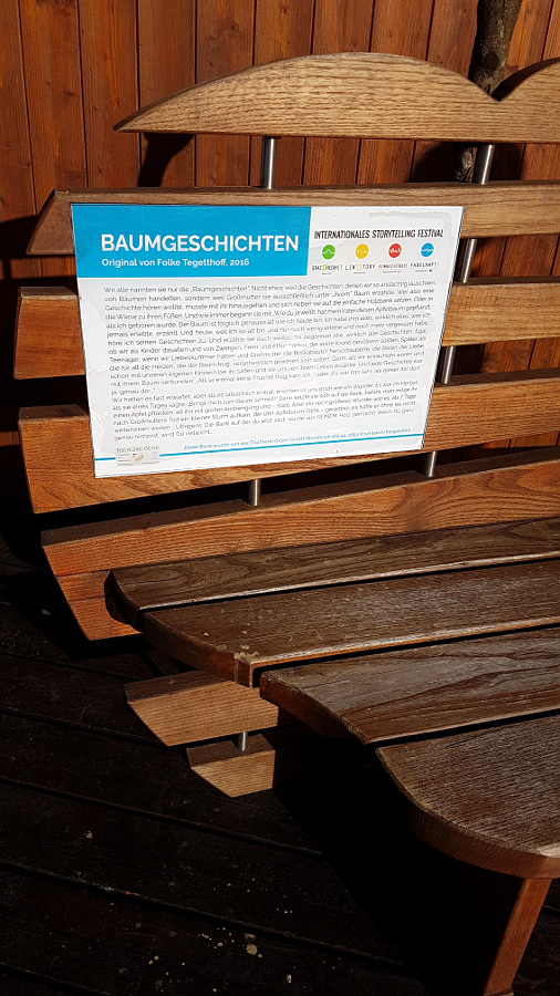 Seit 1988 findet in Österreich das Internationale Erzählfestival in verschiedenen Ausprägungen statt, seit 2007 gibt es fabelhaft!NIEDERÖSTERREICH. Einer der Standorte ist der Kurort Bad Schönau in der Buckligen Welt. Wie ich heute bei einem Spaziergang entdeckt habe, weisen verschiedene Elemente im Ort auf diese wunderbare Veranstaltung hin, zum Beispiel im Kurpark. Der Initiator des Festivals, Folke Tegetthoff, schrieb für fünf ganz individuell gestaltete Holzbänke im Kurpark eigene Märchen mit Bezug zu Bäumen – Baumgeschichten eben.
